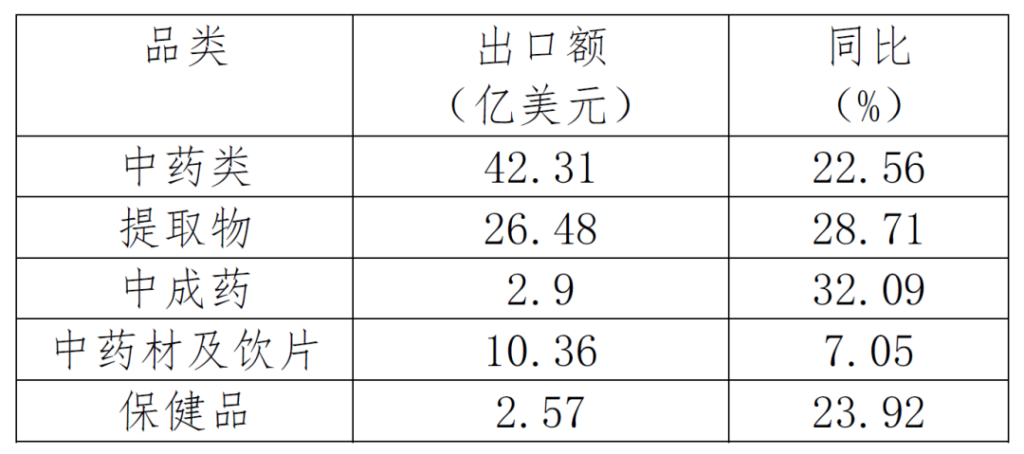 1-9月,中藥類產(chǎn)品出口額42.31億美元,同比增長22.56%。從中藥類細(xì)分產(chǎn)品看,占比最多的中藥提取物出口額26.48億美元,同比增長28.71%;此外,中藥材及飲片出口額10.36億美元,同比增長7.05%;中成藥出口額2.9億美元,同比增長32.09%;保健品出口額2.57億美元,同比增長23.92%。