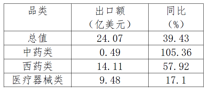 2022年1-9月,中國與俄羅斯醫(yī)藥產(chǎn)品進(jìn)出口貿(mào)易額24.54億美元,同比增長39.49%,其中進(jìn)口額0.46億美元,同比增長42.54%,出口額24.07億美元,同比增長39.43%。其中,中藥類產(chǎn)品出口額0.49億美元,同比增長105.36%;西藥類產(chǎn)品出口額14.11億美元,同比增長57.92%;醫(yī)療器械類產(chǎn)品出口額9.48億美元,同比增長17.1%。