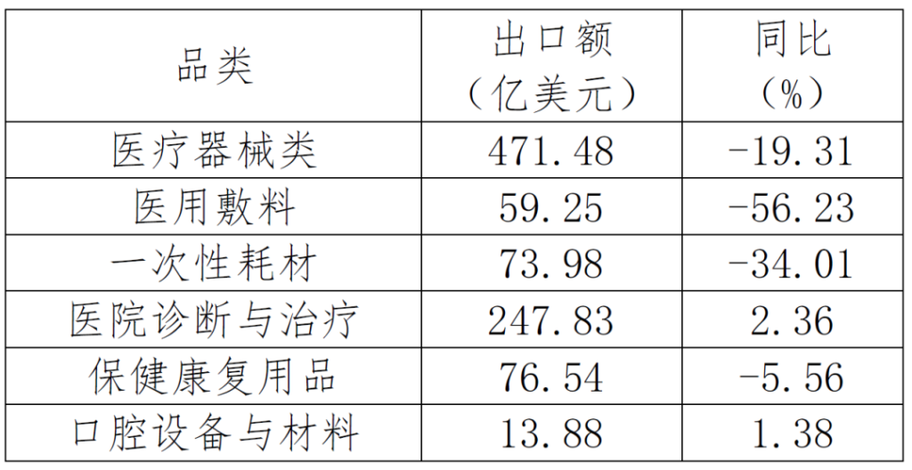 受去年同期高基數(shù)及疫情影響,我國醫(yī)療器械類產(chǎn)品1-9月進(jìn)出口額759.68億美元,同比下降14.6%,其中出口額471.48億美元,同比下降19.31%,進(jìn)口額288.2億美元,同比下降5.57%。醫(yī)療器械類產(chǎn)品出口占我國醫(yī)藥外貿(mào)市場(chǎng)的46.32%,其中醫(yī)用敷料出口額59.25億美元,同比下降56.23%,一次性耗材出口額73.98億美元,同比下降34.01%,醫(yī)院診斷與治療產(chǎn)品出口額247.83億美元,同比增長2.36%,保健康復(fù)用品出口額76.54億美元,同比下降5.56%,口腔設(shè)備與材料出口額13.88億美元,同比增長1.38%。
