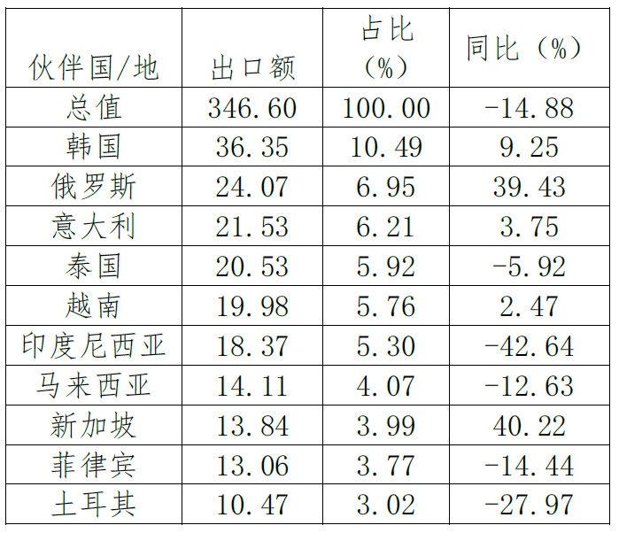 2022年前三季度,對(duì)歐盟、美國、東盟等重點(diǎn)市場(chǎng)因醫(yī)療器械出口下降有不同程度的回落,而對(duì)印度、日本、韓國出口因防疫物資產(chǎn)品所占比重較低,出口額分別增長8.41%、3.35%和9.25%。此外,與俄羅斯醫(yī)藥貿(mào)易伙伴關(guān)系進(jìn)一步加強(qiáng),對(duì)俄出口24.07億美元,同比增長39.43%。