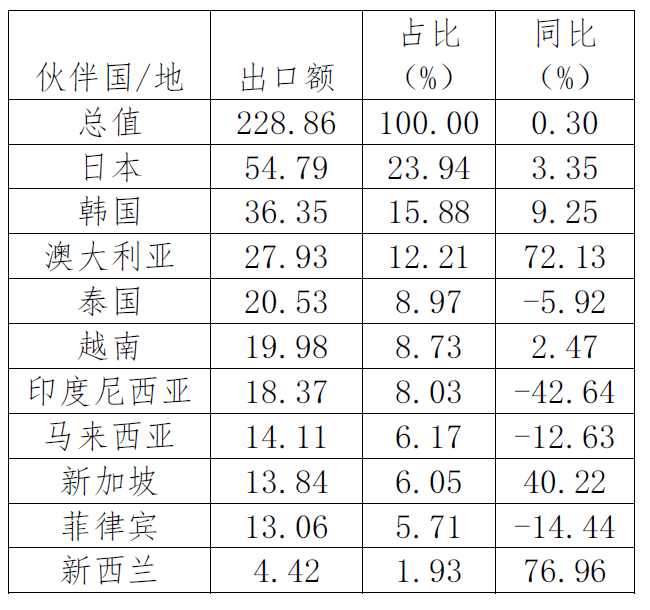 表7. 2022年前三季度我國醫(yī)藥產(chǎn)品出口RCEP前十大市場(chǎng)