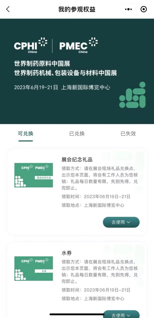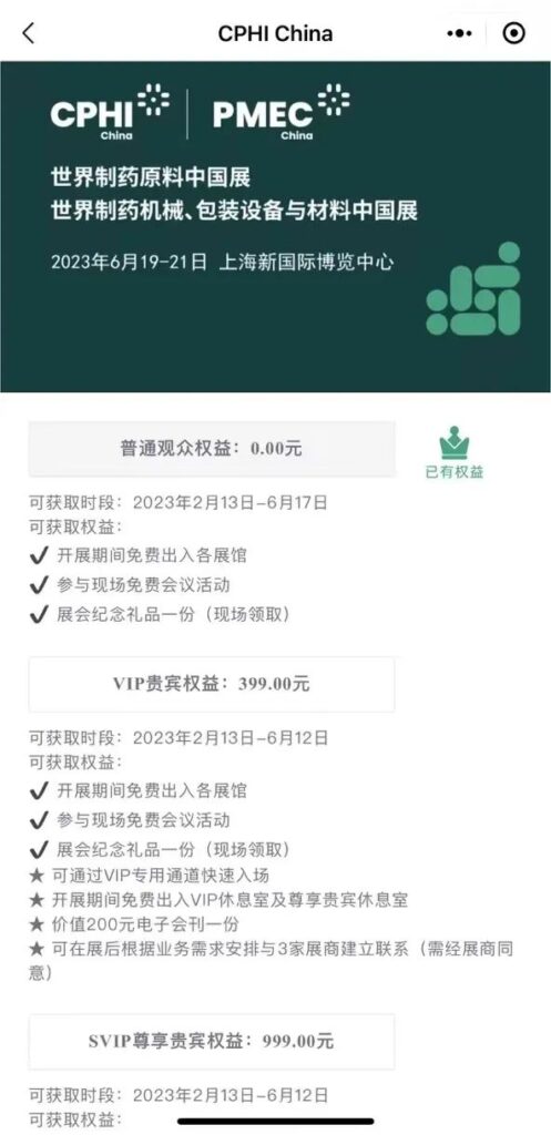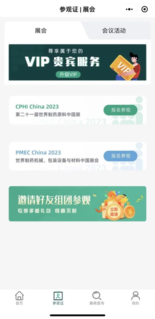 獲取參觀證后,您可以進一步升級為VIP/SVIP觀眾,盡享專用通道、貴賓休息室、電子會刊、午餐、制藥研習社會員、私密會議室、展商建聯(lián)等更多貴賓權益。(具體服務以票種說明為準)