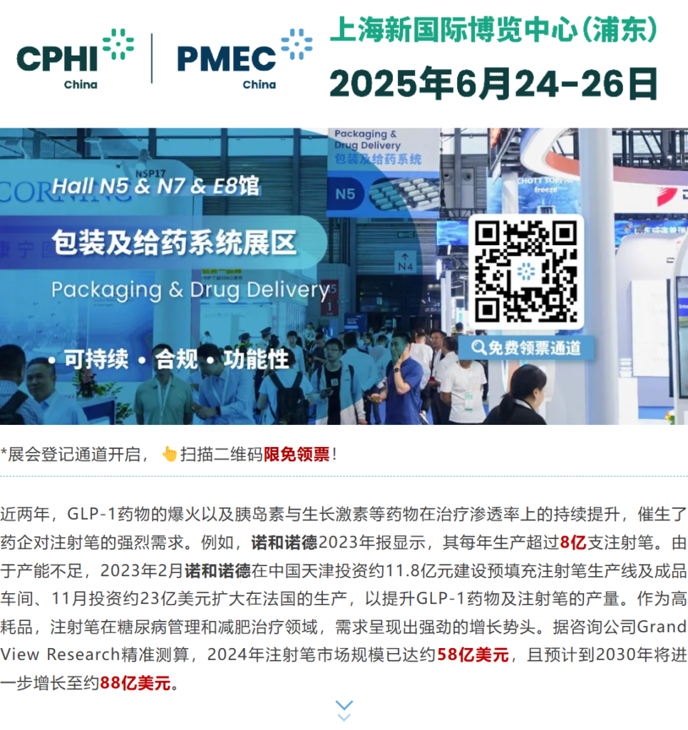 近兩年,GLP-1藥物的爆火以及胰島素與生長(zhǎng)激素等藥物在治療滲透率上的持續(xù)提升,催生了藥企對(duì)注射筆的強(qiáng)烈需求。例如,諾和諾德2023年報(bào)顯示,其每年生產(chǎn)超過(guò)8億支注射筆。由于產(chǎn)能不足,2023年2月諾和諾德在中國(guó)天津投資約11.8億元建設(shè)預(yù)填充注射筆生產(chǎn)線及成品車間、11月投資約23億美元擴(kuò)大在法國(guó)的生產(chǎn),以提升GLP-1藥物及注射筆的產(chǎn)量。作為高耗品,注射筆在糖尿病管理和減肥治療領(lǐng)域,需求呈現(xiàn)出強(qiáng)勁的增長(zhǎng)勢(shì)頭。據(jù)咨詢公司Grand View Research精準(zhǔn)測(cè)算,2024年注射筆市場(chǎng)規(guī)模已達(dá)約58億美元,且預(yù)計(jì)到2030年將進(jìn)一步增長(zhǎng)至約88億美元。