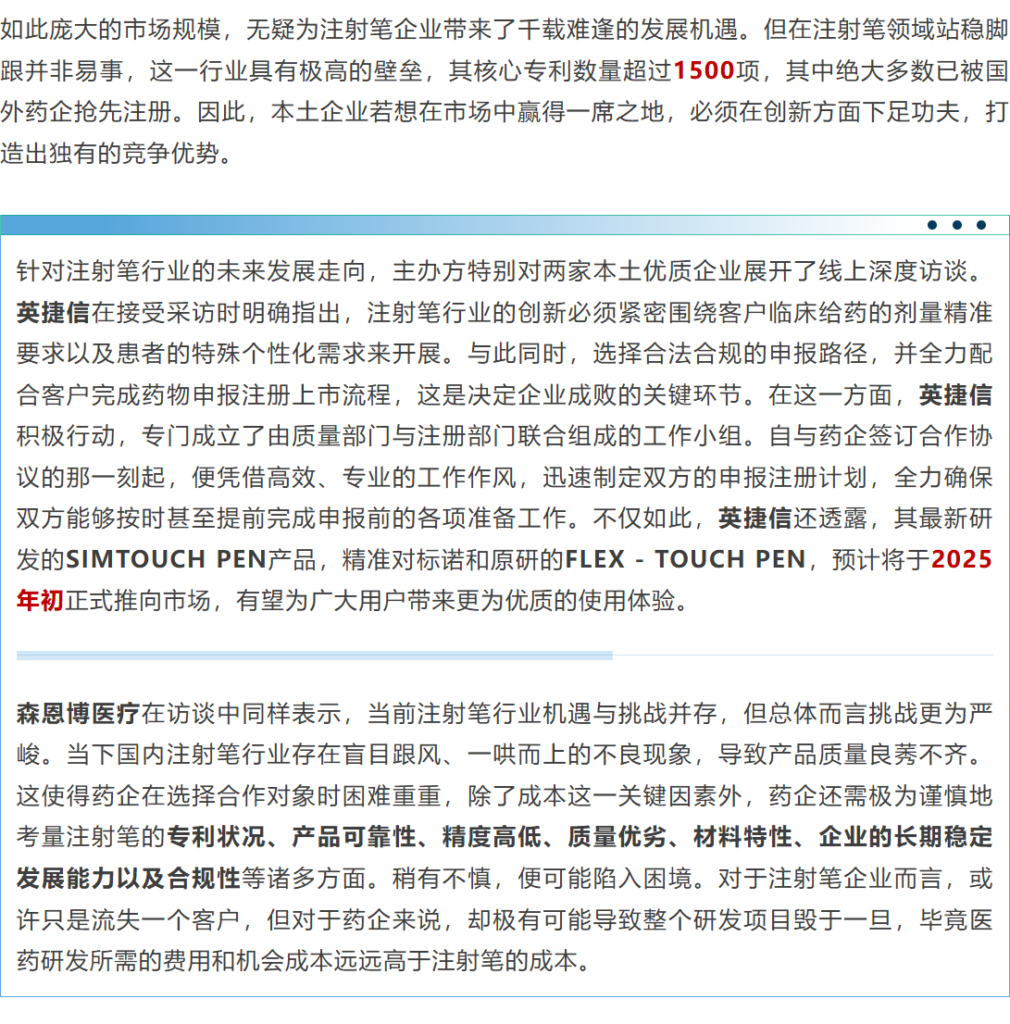 針對(duì)注射筆行業(yè)的未來(lái)發(fā)展走向,主辦方特別對(duì)兩家本土優(yōu)質(zhì)企業(yè)展開(kāi)了線上深度訪談。英捷信在接受采訪時(shí)明確指出,注射筆行業(yè)的創(chuàng)新必須緊密圍繞客戶臨床給藥的劑量精準(zhǔn)要求以及患者的特殊個(gè)性化需求來(lái)開(kāi)展。與此同時(shí),選擇合法合規(guī)的申報(bào)路徑,并全力配合客戶完成藥物申報(bào)注冊(cè)上市流程,這是決定企業(yè)成敗的關(guān)鍵環(huán)節(jié)。在這一方面,英捷信積極行動(dòng),專門成立了由質(zhì)量部門與注冊(cè)部門聯(lián)合組成的工作小組。自與藥企簽訂合作協(xié)議的那一刻起,便憑借高效、專業(yè)的工作作風(fēng),迅速制定雙方的申報(bào)注冊(cè)計(jì)劃,全力確保雙方能夠按時(shí)甚至提前完成申報(bào)前的各項(xiàng)準(zhǔn)備工作。不僅如此,英捷信還透露,其最新研發(fā)的SIMTOUCH PEN產(chǎn)品,精準(zhǔn)對(duì)標(biāo)諾和原研的FLEX – TOUCH PEN,預(yù)計(jì)將于2025年初正式推向市場(chǎng),有望為廣大用戶帶來(lái)更為優(yōu)質(zhì)的使用體驗(yàn)。