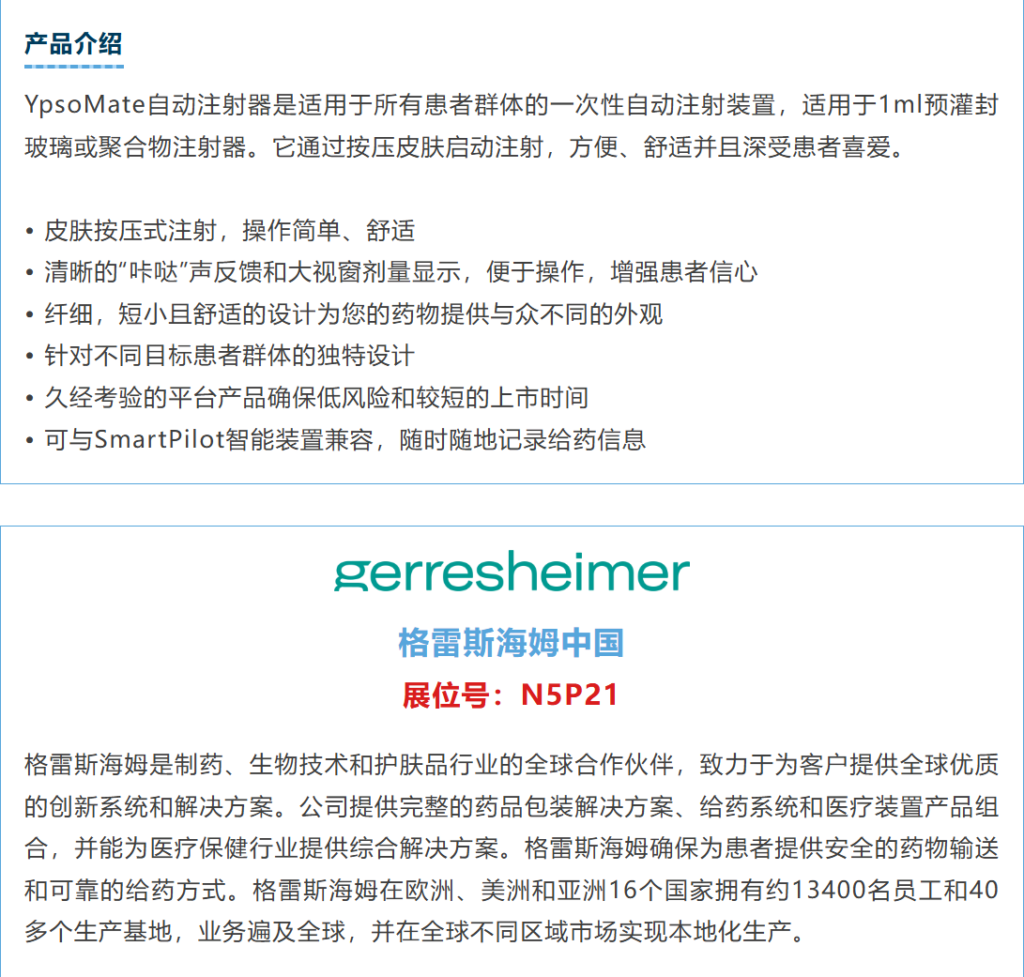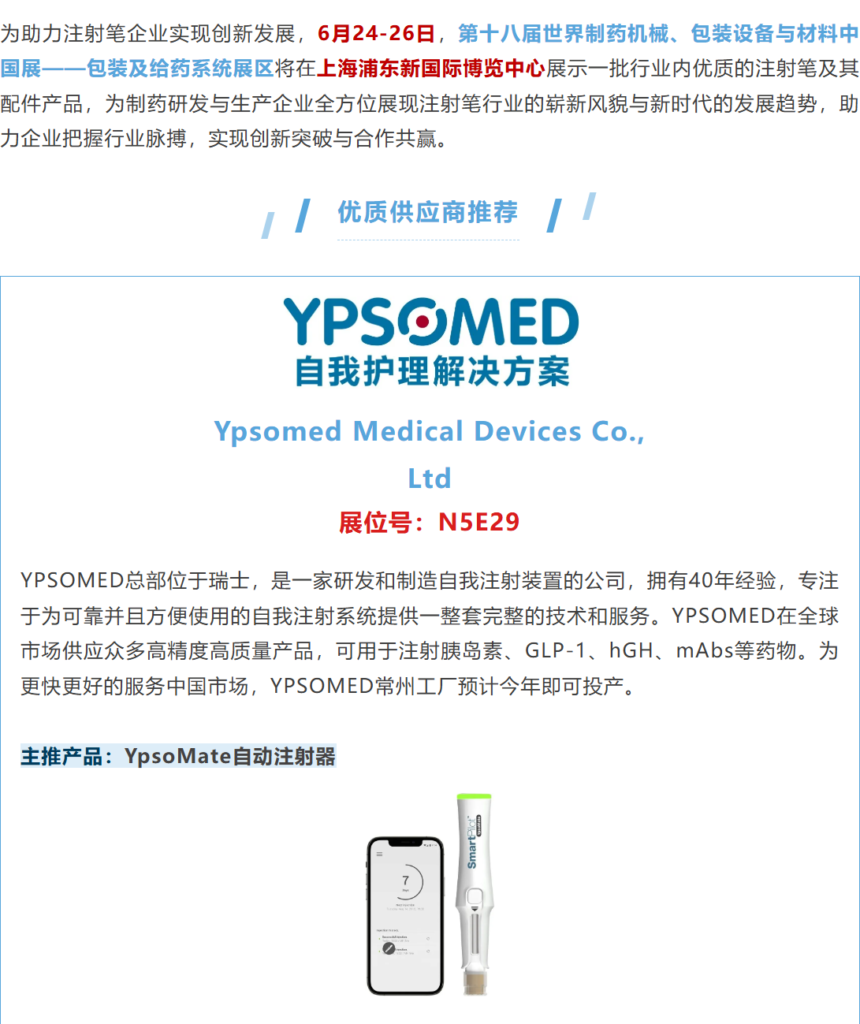 YPSOMED總部位于瑞士,是一家研發(fā)和制造自我注射裝置的公司,擁有40年經(jīng)驗(yàn),專注于為可靠并且方便使用的自我注射系統(tǒng)提供一整套完整的技術(shù)和服務(wù)。YPSOMED在全球市場(chǎng)供應(yīng)眾多高精度高質(zhì)量產(chǎn)品,可用于注射胰島素、GLP-1、hGH、mAbs等藥物。為更快更好的服務(wù)中國(guó)市場(chǎng),YPSOMED常州工廠預(yù)計(jì)今年即可投產(chǎn)。
