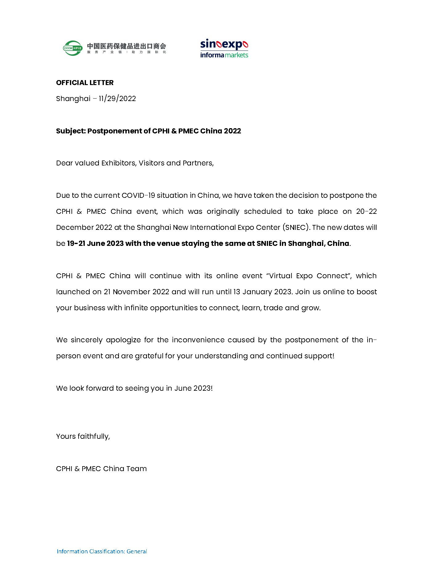 CPHI & PMEC China event, which was originally scheduled to take place on 20-22 December 2022 at the Shanghai New International Expo Center (SNIEC). The new dates will